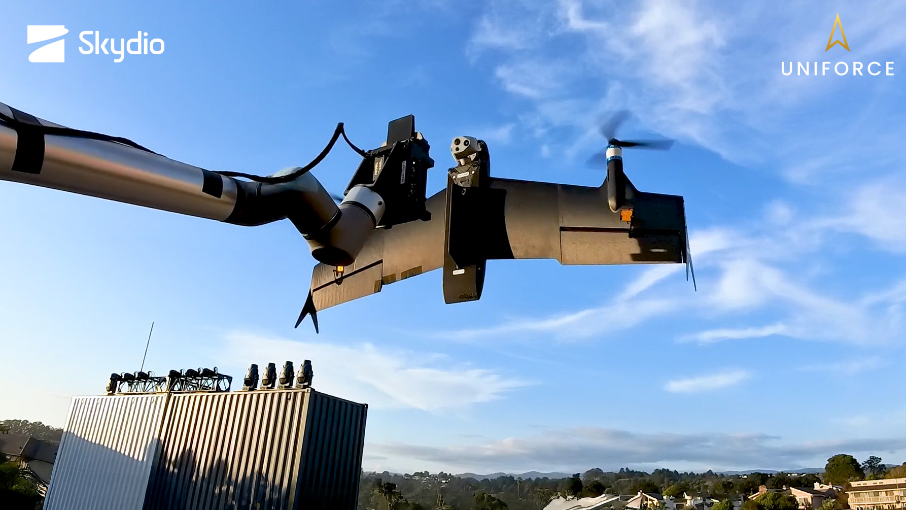To, co zaskoczeniem może natomiast być, to nietypowy system startu i lądowania: Skydio F10 startuje i ląduje pionowo, z ruchomego ramienia. O ile start wydaje się relatywnie prosty, o tyle lądowanie jest już trudniejsze - ramię musi precyzyjnie przechwycić zbliżającego się do niego drona, na bieżąco uwzględniając np. podmuchy wiatru.