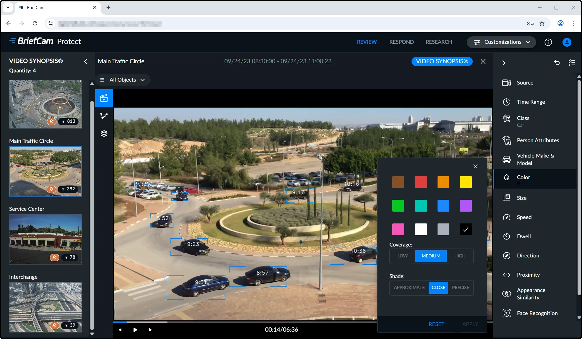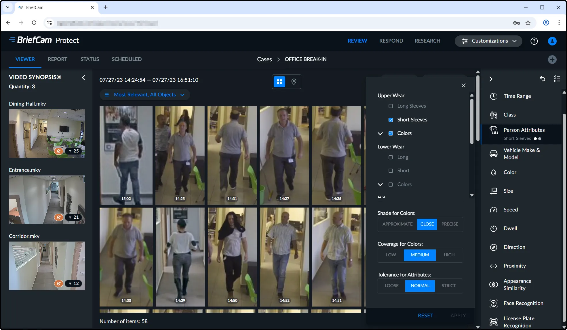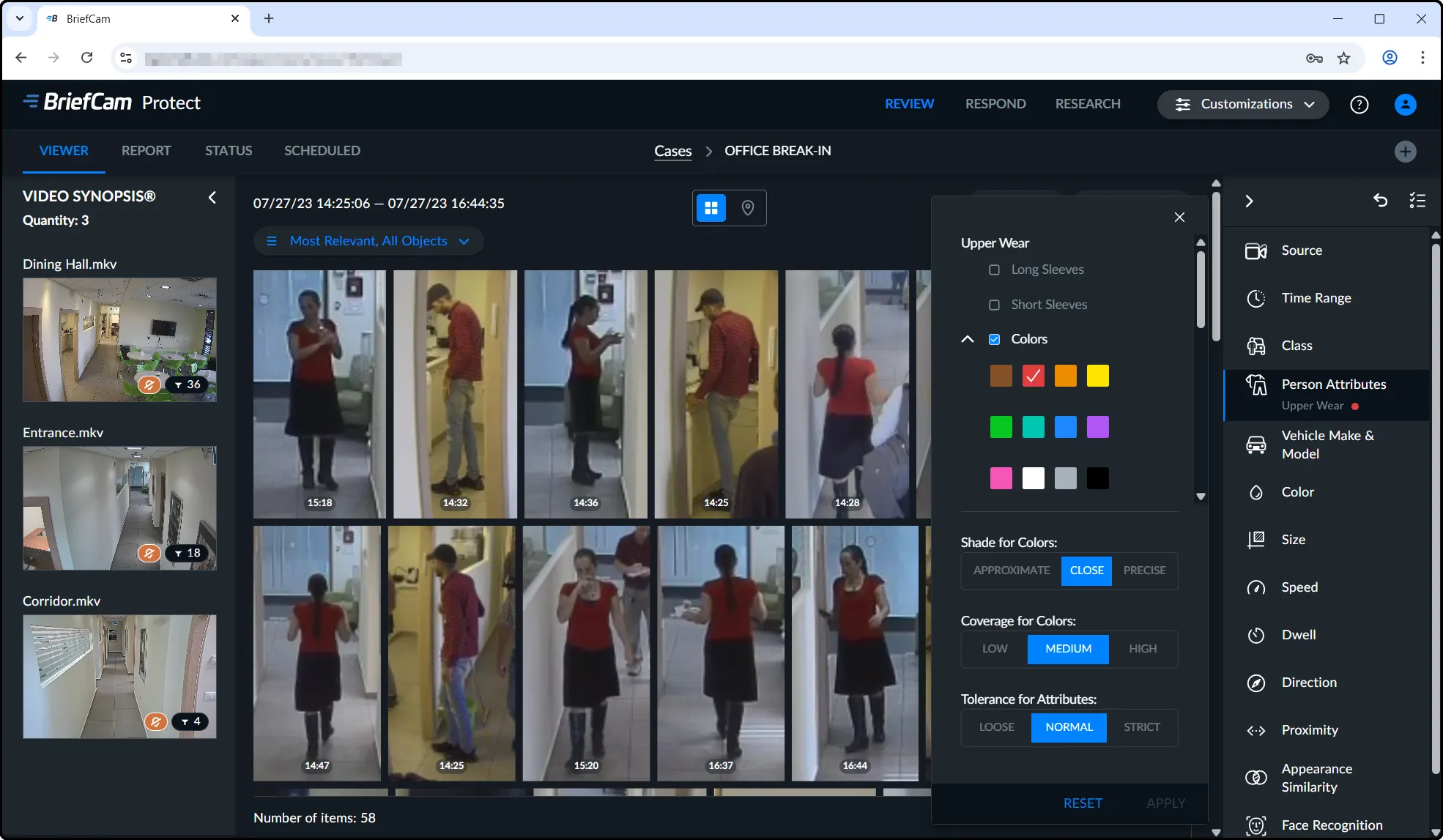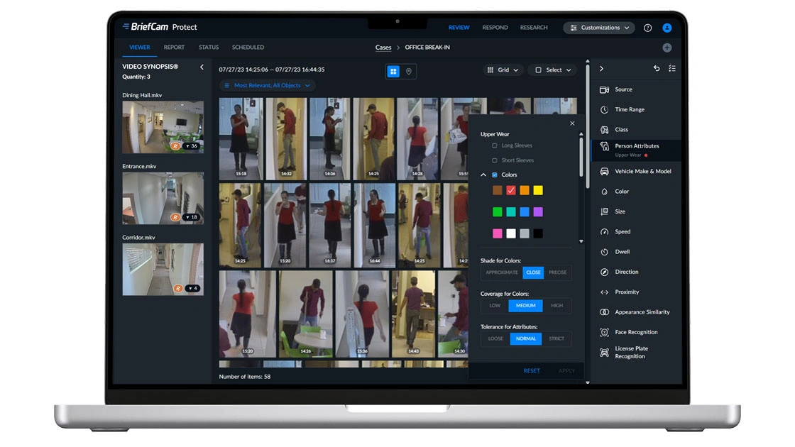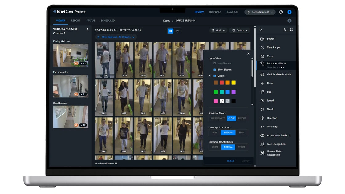 Przyspiesz śledztwa, przeglądając godziny nagrań wideo w ciągu kilku minut i szybko lokalizując interesujące obiekty i osoby dzięki stale rozbudowywanemu zestawowi filtrów wyszukiwania.