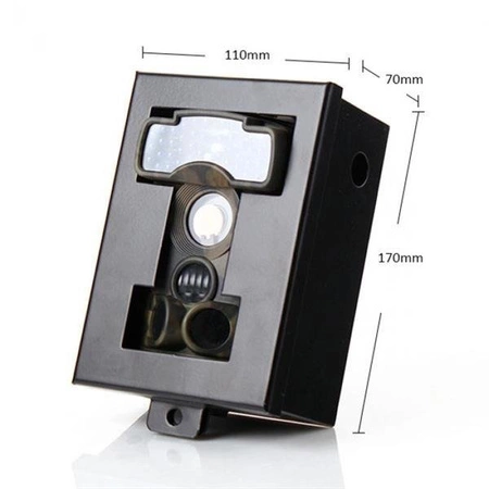 - Czarna metalowa obudowa zapewnia solidną ochronę fotopułapki. Dzięki tej obudowie fotopułapka nie jest narażona na zniszczenia przez zwierzynę czy człowieka. Posiada uchwyt który pozwala zamontować ją w rożnych miejscach i pod różnymi kątami. W zestawie k