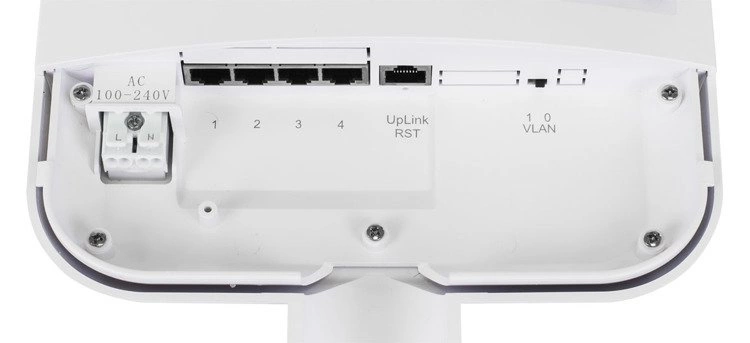 Parametry: 4x LAN/PoE+, 1x LAN typu UpLink, 802.3u, 802.3at, 802.3af, moc maksymalna PoE: 30W/port i 120W na całość; IP65, montaż za pomocą opasek zaciskowych do masztu lub elewacji, zasilanie: 48V DC. Pobór prądu: 9W, waga: 1,3kg, temperatura pracy -20°C ÷ +55°C.