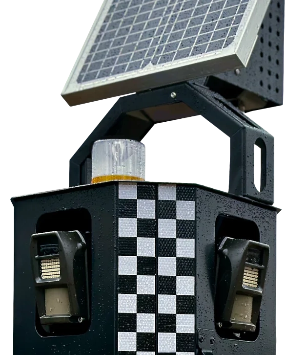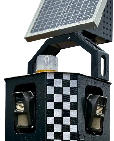 Sentinel to kompletny zestaw urządzeń Reconeyez – 4 detektory, mostek, syrena, panel solarny i solarna lampa stroboskopowa – zainstalowane w wytrzymałej obudowie na stojaku.